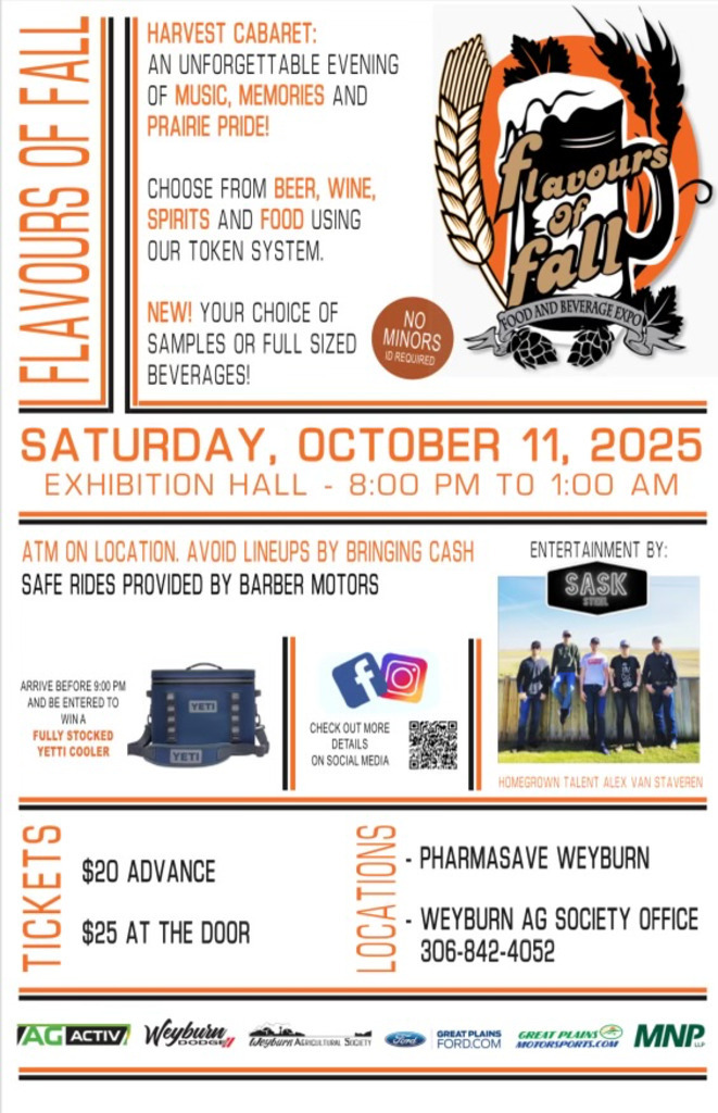 Weyburn Agricultural Society presents the 8th Annual Flavours of Fall Saturday October 11, 2025 8:00 pm to 1:00 am in Exhibition Hall.