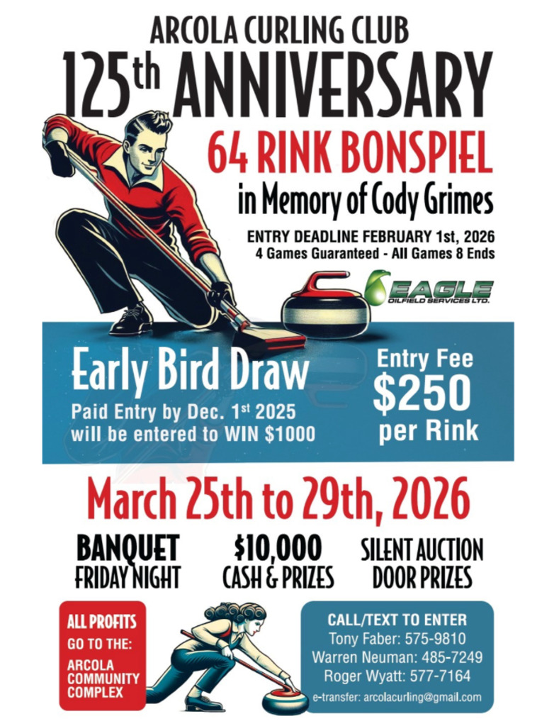 The 2025-2026 Curling Season commemorates a monumental milestone for the Arcola Curling Club, this year commemorates 125 Years of the club’s existence, and this year we are planning on celebrating this milestone by hosting at 64 Rink Bonspiel.