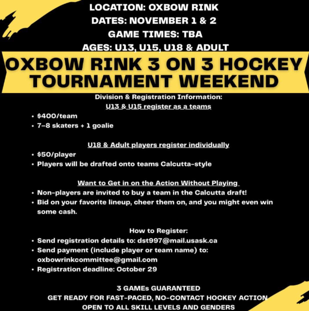 Oxbow rink is hosting a 3 on 3 Tournament. I 13/U15 play on November 1, seniors will play that evening and November 2.