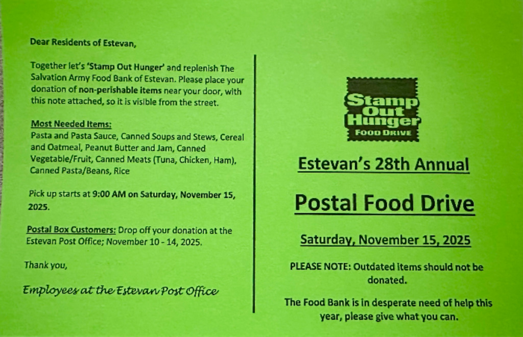 Postal Box Customers (or anyone that didn’t receive a flyer): Drop off your donation at the Estevan Post Office; November 10 - 14, 2025.