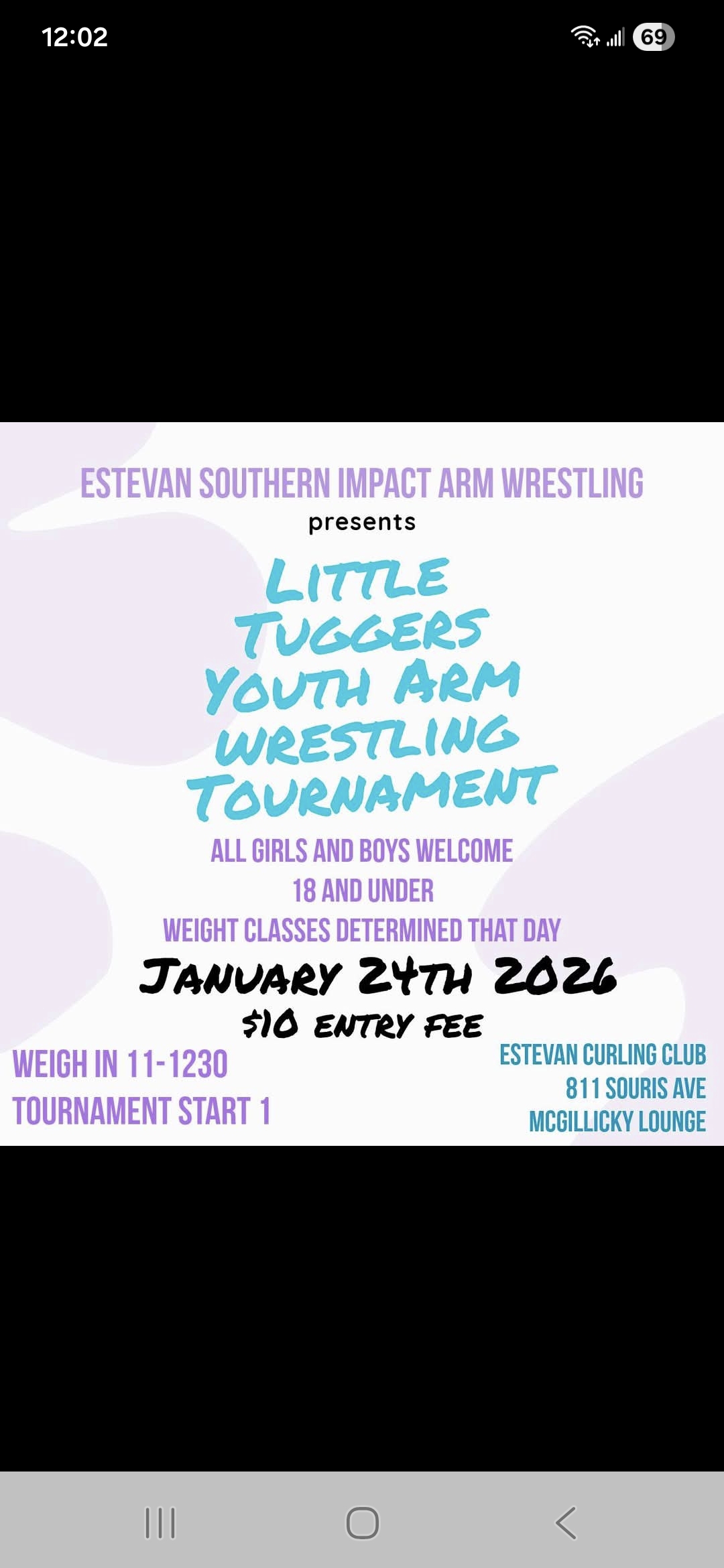 Estevan Southern Impact Armwrestling is hosting its 1st youth 18 and under arm wrestling competition January 24th at the Estevan Curling Club. Open competition for boys and girls. Weigh inns are from 11-12:30 and competition is at 1:00. Come down and give it a try or just cheer on your local youth. No door admission for spectators.