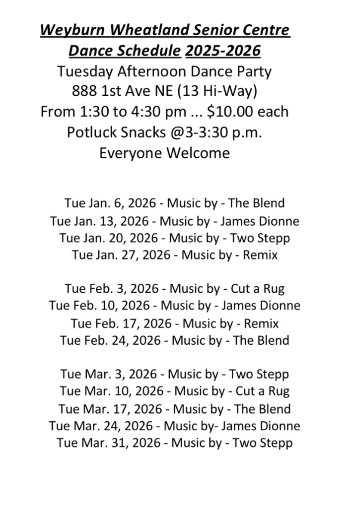 Join us every Tuesday afternoon from 1:30 till 4:30 at Weyburn Wheatland Senior Centre for an afternoon of dancing, socializing, entertainment, snacks and a whole lot fun. Potluck snacks at 3-3:30.