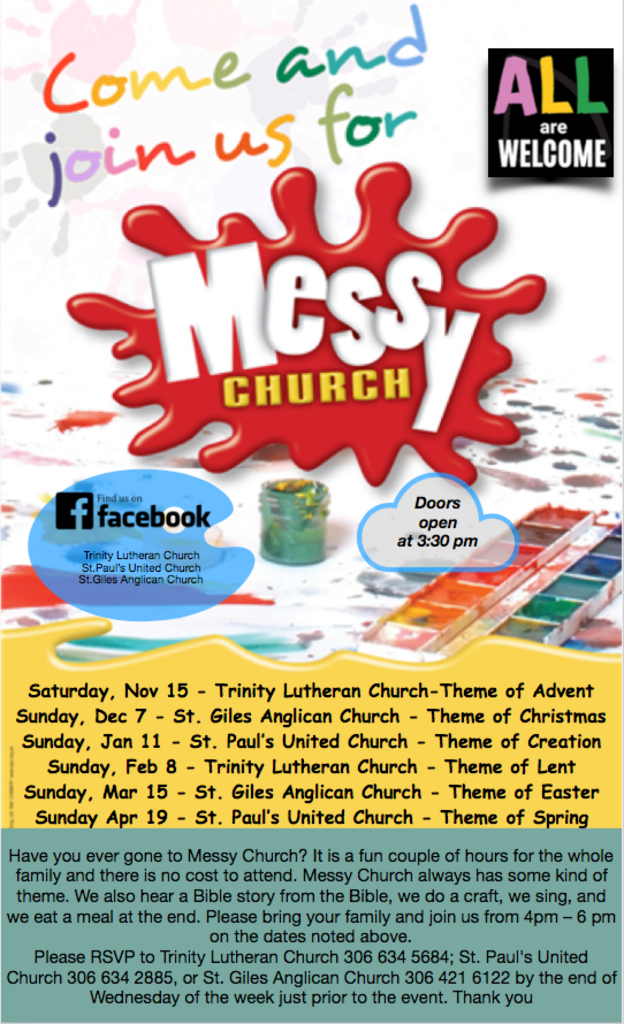 Messy Church will be held at St. Giles Anglican Church on March 15th with the theme, Easter. Please bring your family and join us from 4–6 pm for this free event at 738 2nd Street, Estevan. Doors open at 3:30pm. There will be an Easter egg hunt, singing, bible story, craft, and a meal. All are welcome!