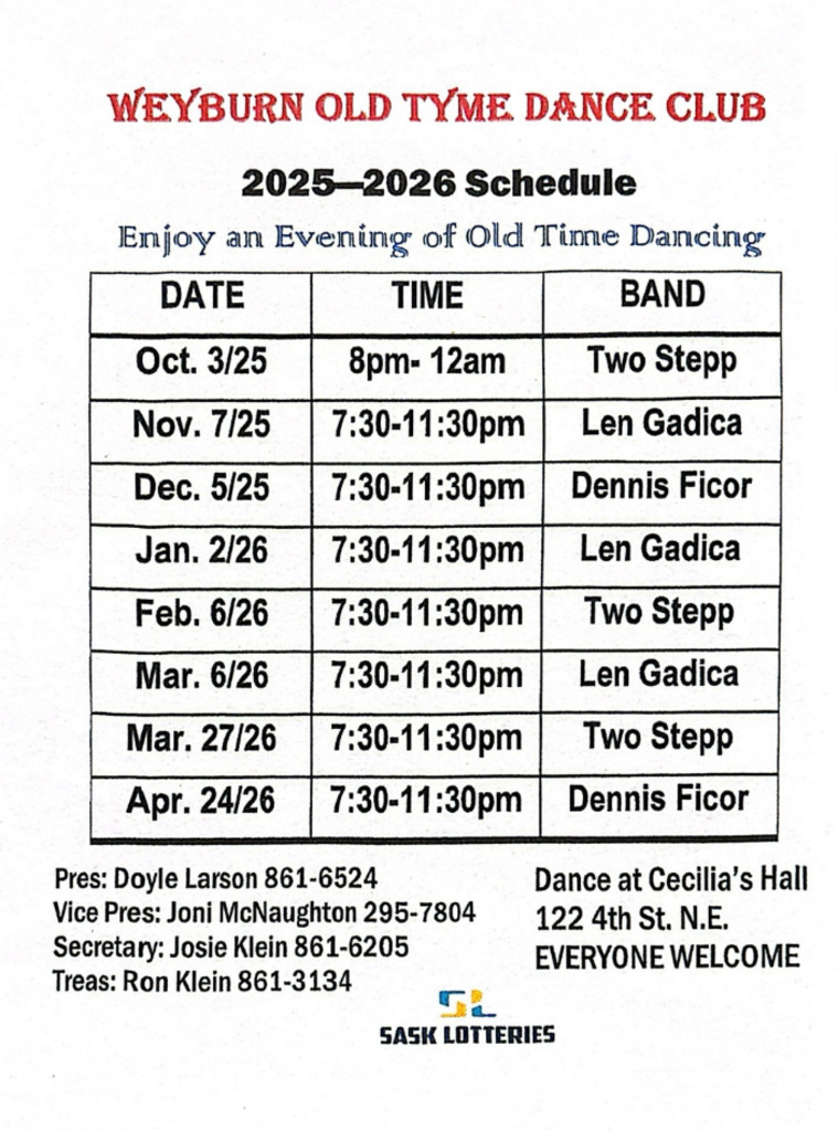Join us for an evening of socializing and dancing to great music at Cecilia’s Hall in Weyburn. The bands include”Len Gadica”, “Two Stepp” or “Dennis Ficor”. 7:30 pm- 11:30 pm with lunch provided. $15.00 at the door!