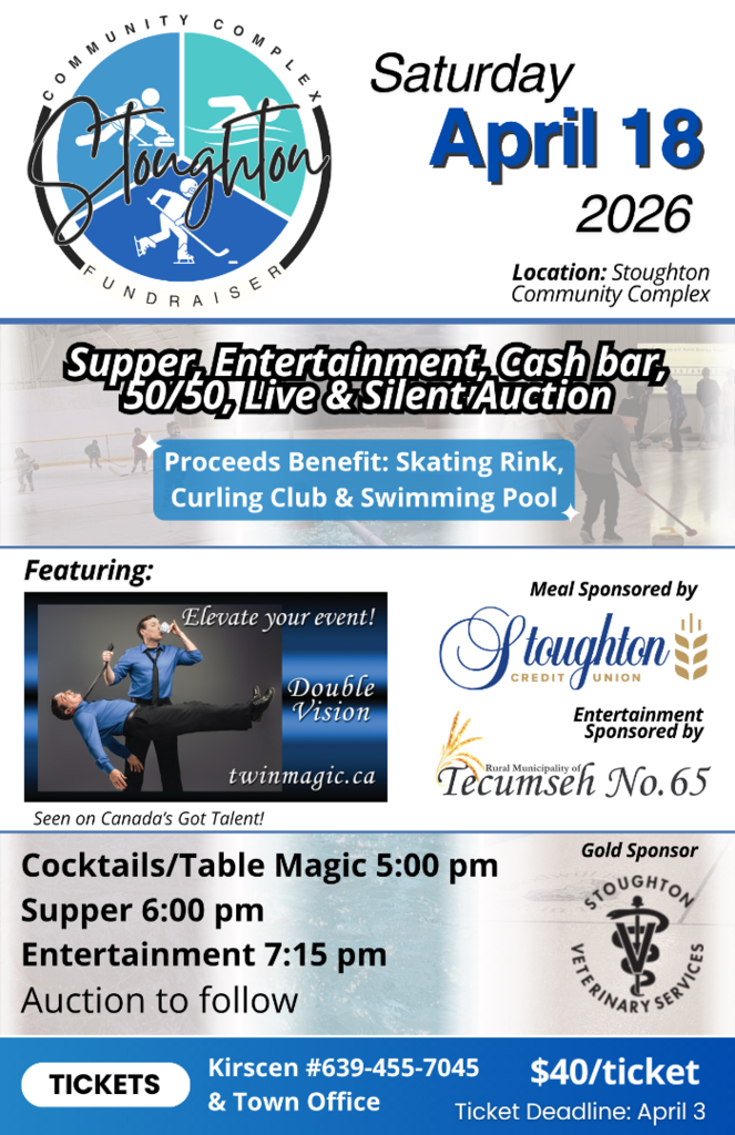 The 2nd Annual Stoughton Community Complex Fundraiser will be held on April 18th, 2026. The evening will include supper, live entertainment by Double Vision Magic, and both a silent and live auction. All funds raised will directly support improvements and enhancements to our community complex facilities for the benefit of residents.